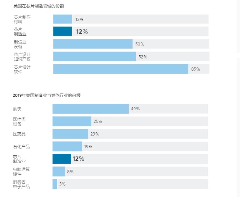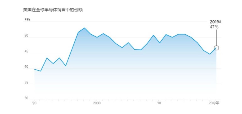 WSJ 指出,除英特尔外的主要美国半导体企业都选择将其生产工作外包给台积电和三星等厂商,截至 2019 年,美国公司在半导体销售中的份额约为 47% 。