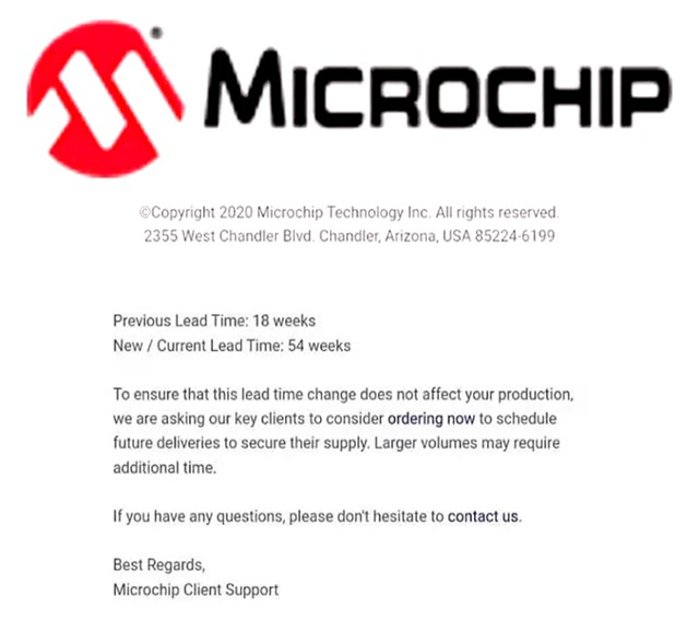 1月4日,Microchip发布涨价通知,宣布自2021年1月15日起,Microchip将提高多条产品线的价格。近日,几天时间,Microchip再次发函,表示产品交期将大幅延长,将从原来的18周延长至54周。