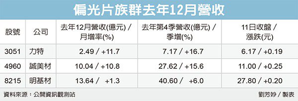 北京时间01月27日消息,中国触摸屏网讯,偏光片三雄 本季不淡。因远距需求带动面板出货,也激励面板关键零组件偏光片需求,偏光片厂明基材(8215)、诚美材及力特三家去年12月营收冲高,其中诚美材及力特月增率均逾一成,表现最强;三家业者去年第4季营收均为去年全年最高。本季虽处于淡季,但在供需吃紧下,偏光片族群本季淡季不看淡。
